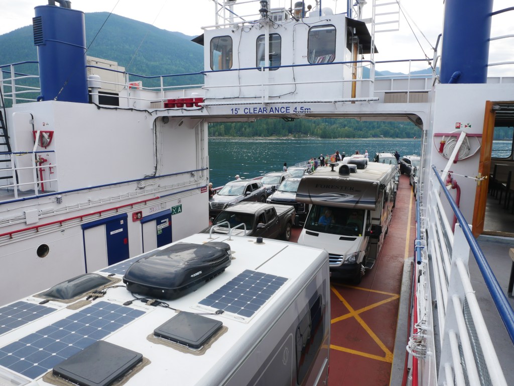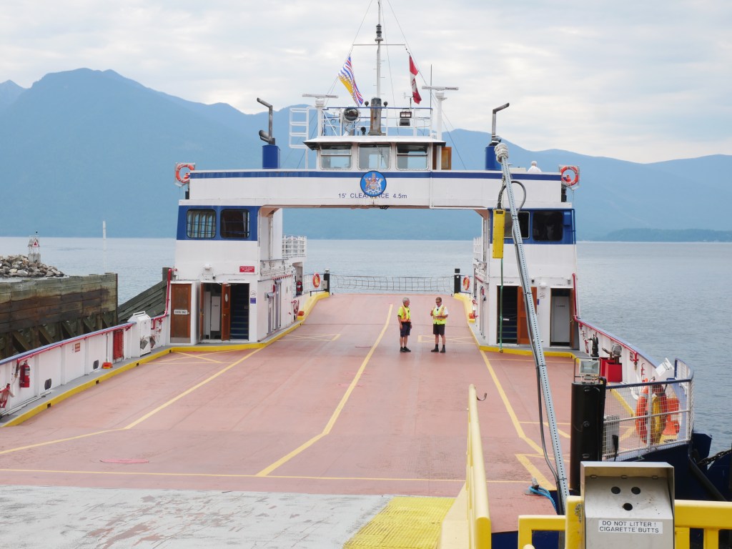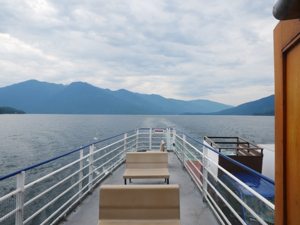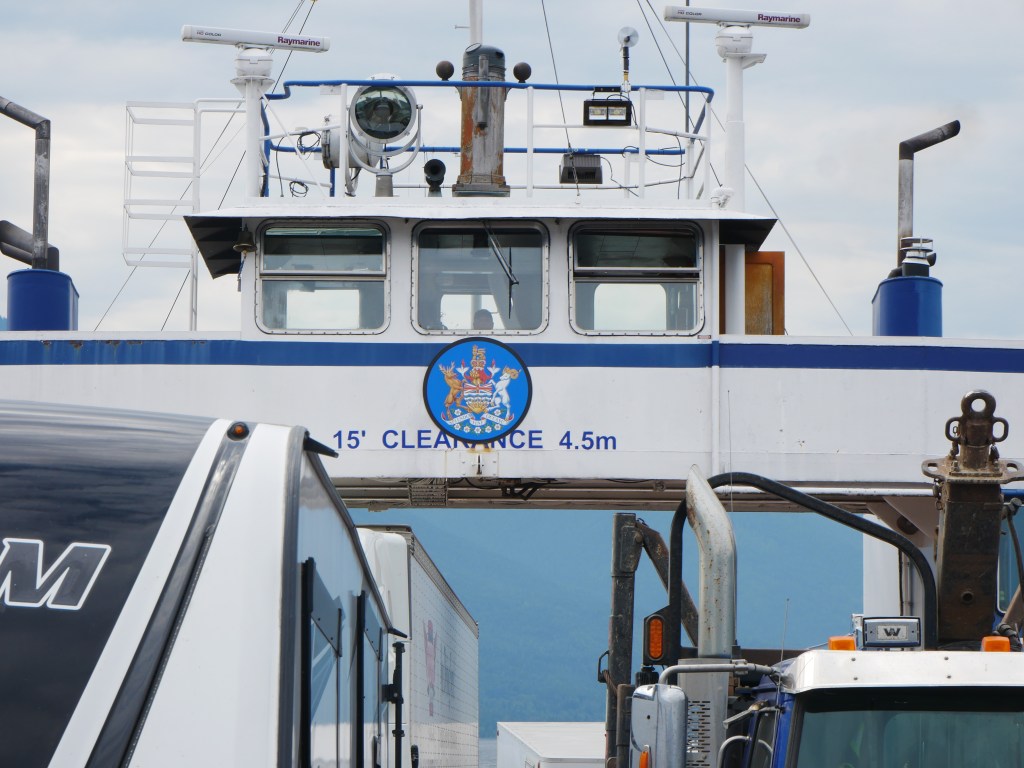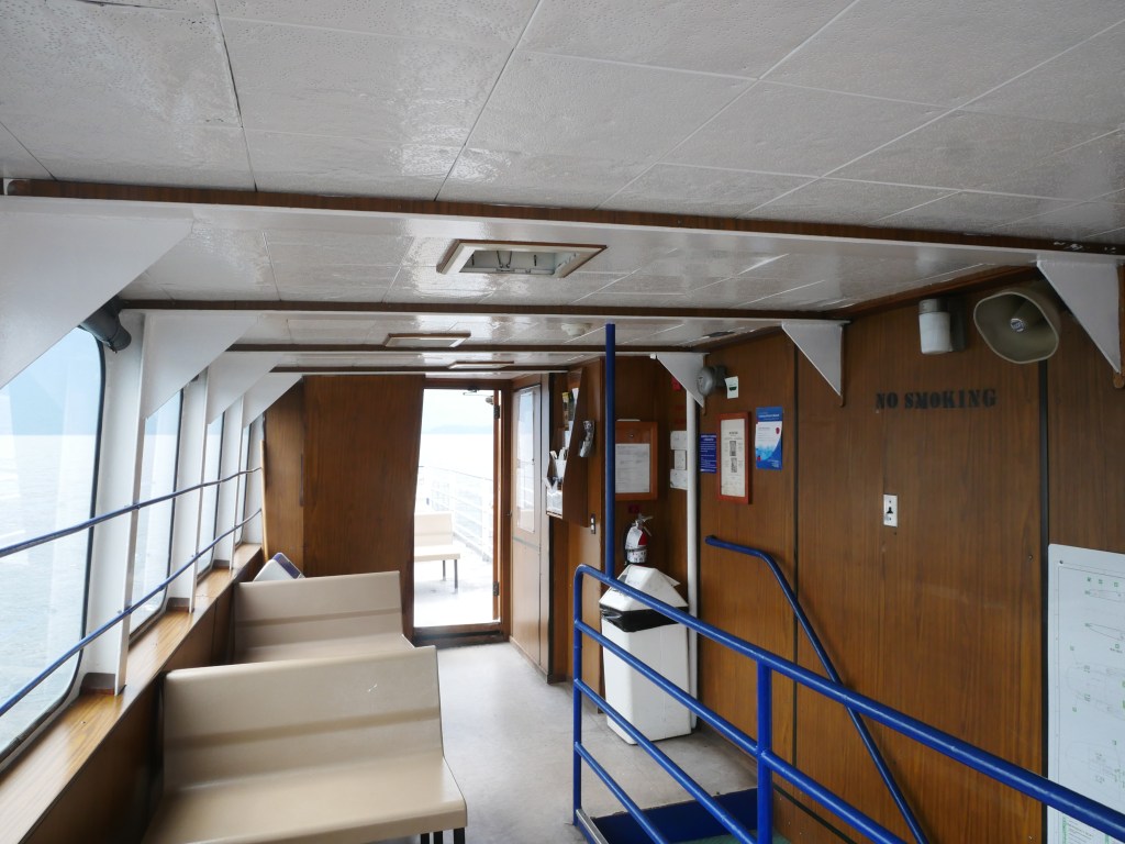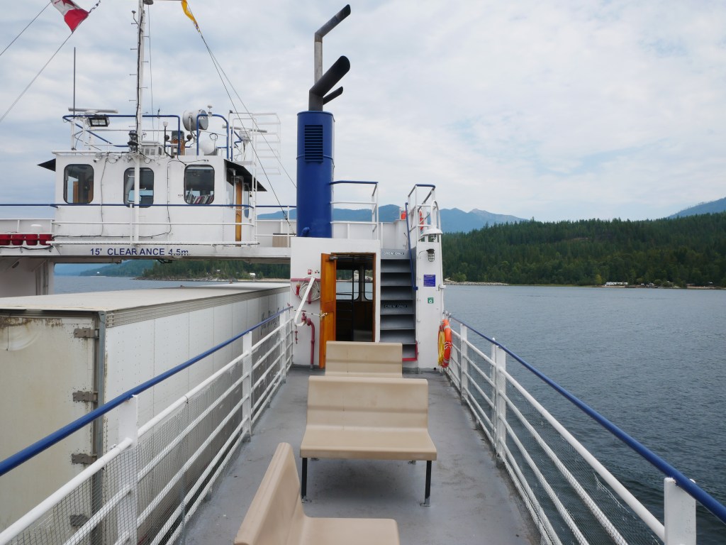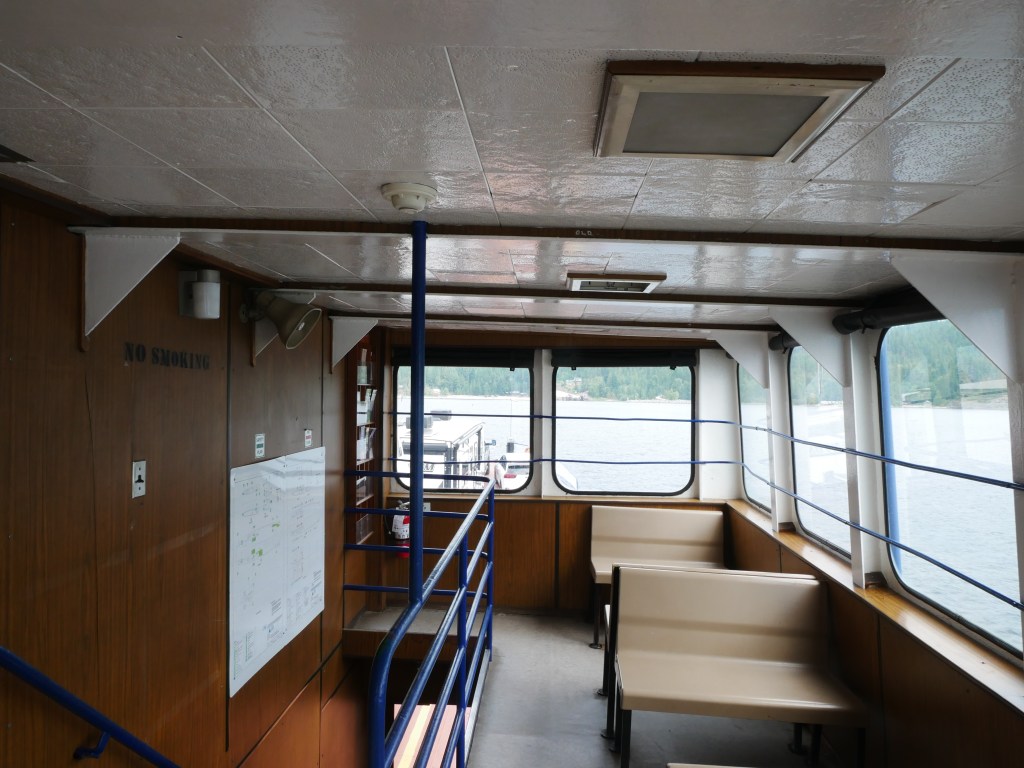 The Balfour is the older and smaller of the two ferries that serve the Balfour-Kootenay Bay Route.She is the last remaining single-ender in the BC InteriorBuilt in 1954, the vessel can carry approximately 28 vehicles and up to 145 passengers.The vessel docks bow-in at Kootenay Bay and stern-to at Balfour.The Balfour only operates during the summer months and whenever the larger and more capable Osprey 2000 is out of service for maintenance. The rest of the year, she sits idle at the Balfour Terminal.There is a small passenger lounge on the starboard side of the vessel. Another view of the passenger lounge, which does not appear to have changed much since 1954…There is a small sun deck immediately aft of the passenger cabin.View forward from the end of the sun deckLooking down on the car deck from the sun deck.Bridge and Coat of Arms