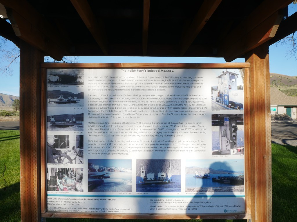 The Keller Ferry crosses Lake Roosevelt, carrying SR 21 between the communities of Clark and Keller.The M/V Sanpoil is the sole vessel on the Keller route. She entered service in July 2013, replacing the then 65-year old Martha S.Departing the Keller LandingInformational Signage at the Keller TerminalLooking down SR 21 towards the Keller LandingFloating BerthSanpoil docked at KellerKeller Landing OverviewThe primary Keller Landing is not capable of operating when lake levels drop below 1,240 feet. During these times, ferry operations move to this alternate landing 1/2 mile further north.Keller’s “Slip 2”Underway, looking back towards KellerAboard the SanpoilBuilder’s PlaqueLooking South towards ClarkArriving at the Clark LandingSanpoil departing ClarkSanpoil en route to KellerHistorical Board at the Clark LandingThe Clark Landing is tucked in the back of a small inlet.Profile view of the Sanpoil docked at ClarkSanpoil departing ClarkShip’s BellEmbarking on another trip to KellerView West from near ClarkLooking towards Keller from about half way across the route