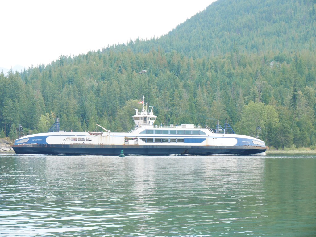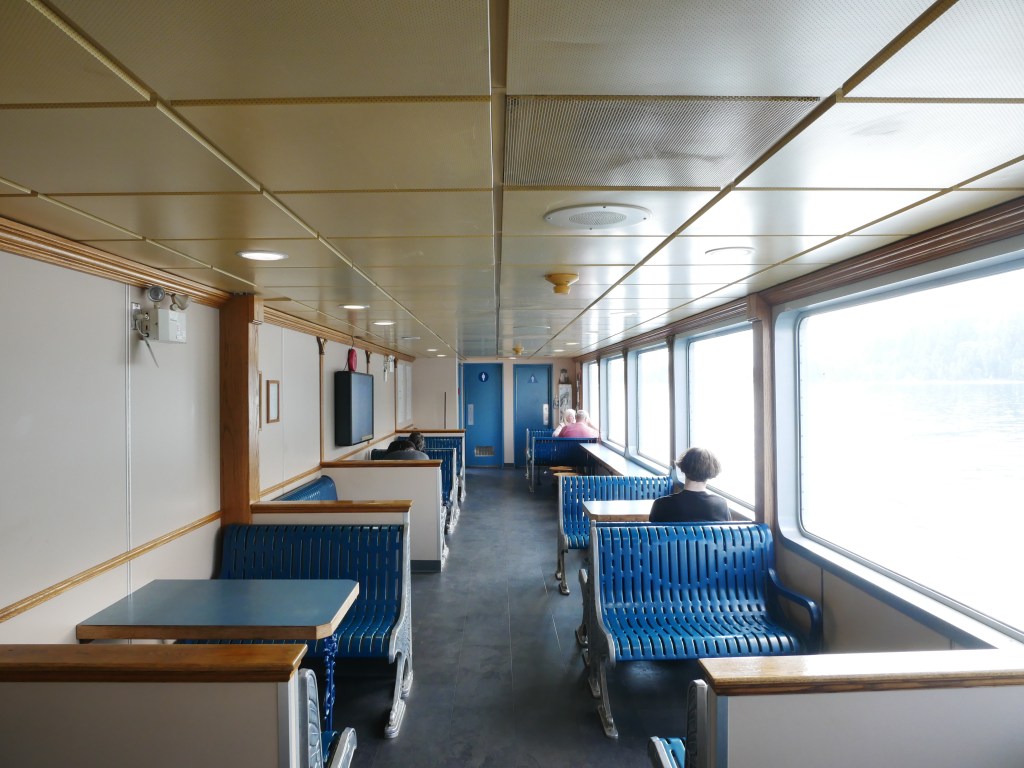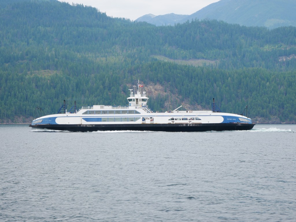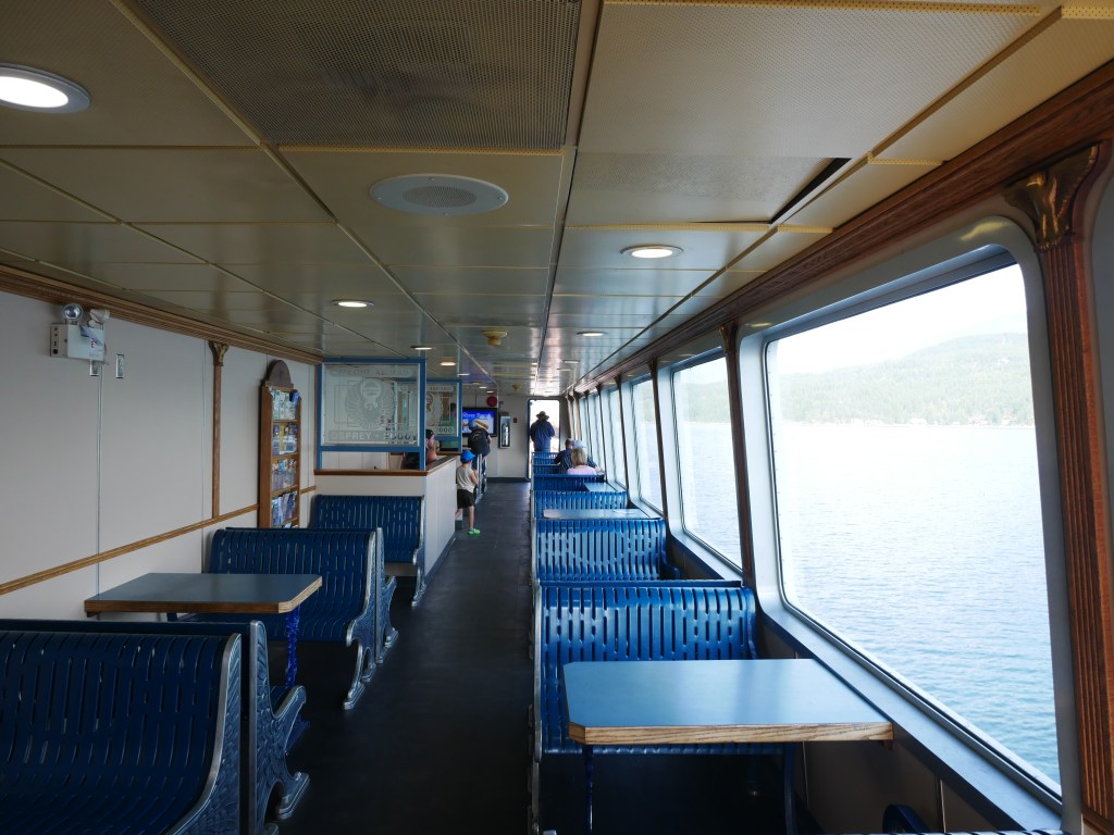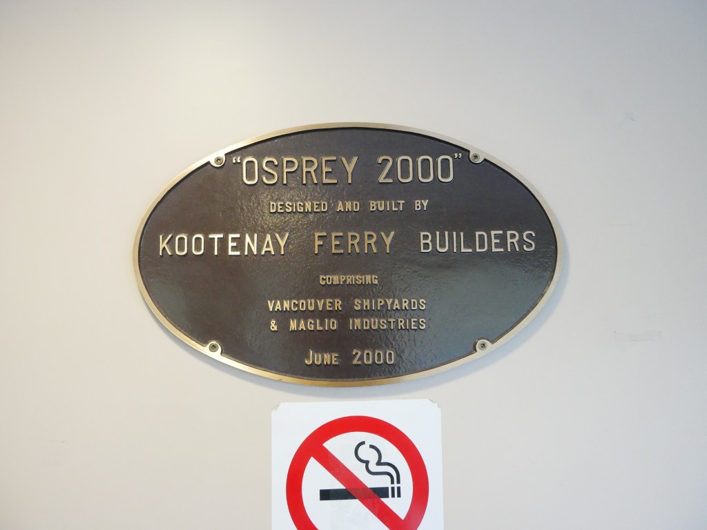 The Osprey 2000 is the newer and larger of the two vessels that operate on the route across Kootenay Lake.The Osprey 2000 en route to Balfour. The vessel is double-ended, with the No. 1 End facing Kootenay Bay and the No. 2 End facing Balfour.Though she is a double-ender, one could make the case that it is looks quite awkward aesthetically when the No. 2 End is the acting bow…The vessel has an open car deck that can accommodate 82 vehicles.View towards the No. 1 EndSmall passenger lounge on the port side on the car deck level.A small alcove beneath the rescue boat. On particularly busy sailings, additional vehicles can be parked in the space between the stairway and the yellow. There is a similar alcove on the starboard side.There is a snack bar on the car deck level on the starboard side.Another view of the snack barOne deck above the snack bar, there is another passenger lounge.Another view of the upper passenger cabinThere is a publicly accessible picklefork forward of the upper passenger cabin.There is a similar picklefork on the port side of the ferry, though that one is home to the rescue boat and public access is limited to the space forward thereof.Builder’s PlaqueOsprey 2000 and running mate Balfour docked at Balfour.Loading vehicles at Kootenay Bay on a chilly March evening.