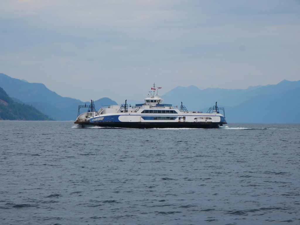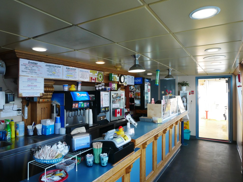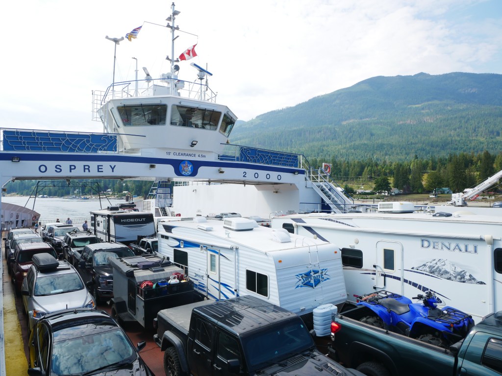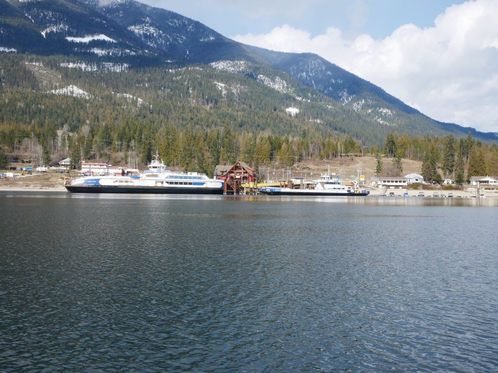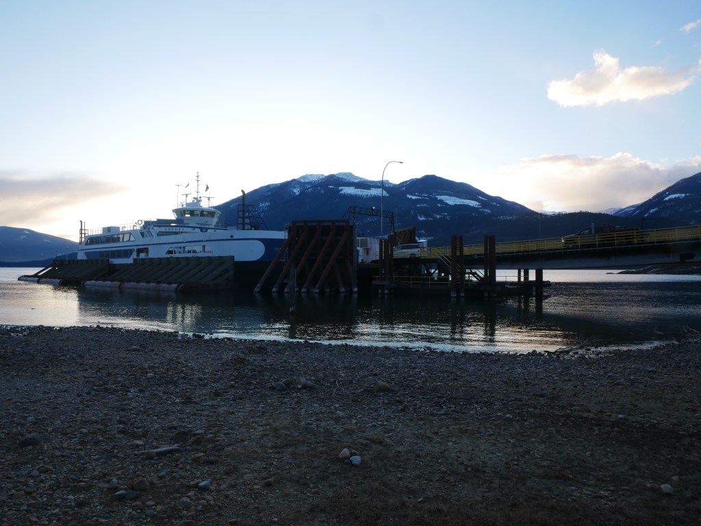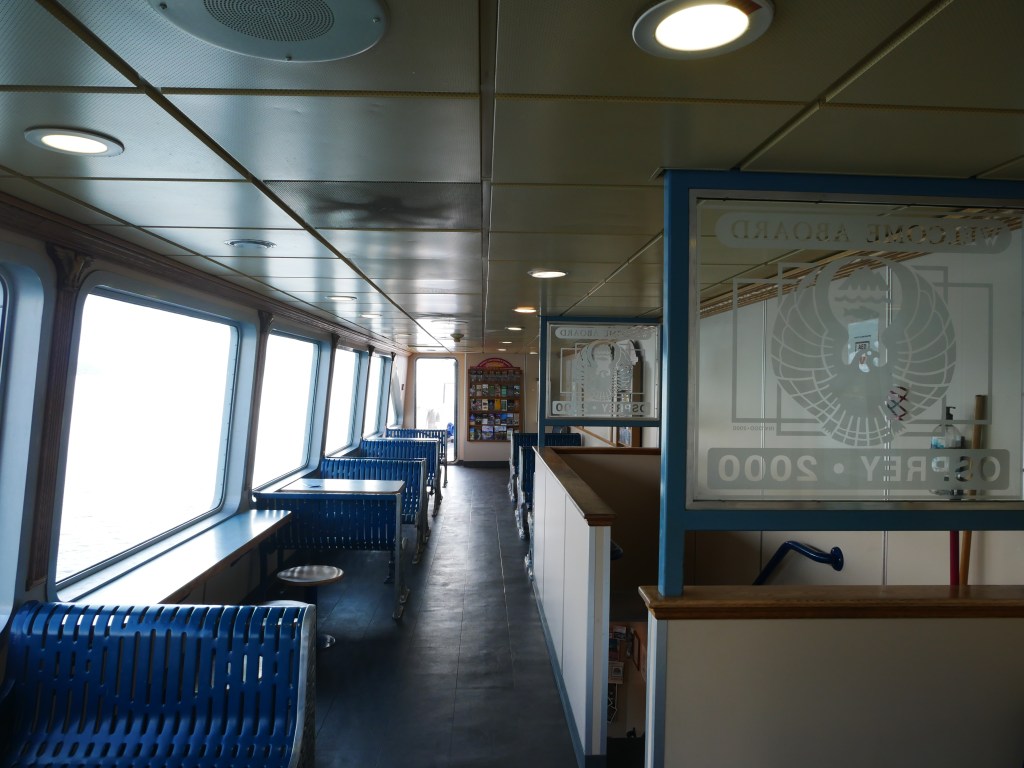 The Osprey 2000 is the newer and larger of the two vessels that operate on the route across Kootenay Lake.The Osprey 2000 en route to Balfour. The vessel is double-ended, with the No. 1 End facing Kootenay Bay and the No. 2 End facing Balfour.Though she is a double-ender, one could make the case that it is looks quite awkward aesthetically when the No. 2 End is the acting bow…The vessel has an open car deck that can accommodate 82 vehicles.View towards the No. 1 EndSmall passenger lounge on the port side on the car deck level.A small alcove beneath the rescue boat. On particularly busy sailings, additional vehicles can be parked in the space between the stairway and the yellow. There is a similar alcove on the starboard side.There is a snack bar on the car deck level on the starboard side.Another view of the snack barOne deck above the snack bar, there is another passenger lounge.Another view of the upper passenger cabinThere is a publicly accessible picklefork forward of the upper passenger cabin.There is a similar picklefork on the port side of the ferry, though that one is home to the rescue boat and public access is limited to the space forward thereof.Builder’s PlaqueOsprey 2000 and running mate Balfour docked at Balfour.Loading vehicles at Kootenay Bay on a chilly March evening.