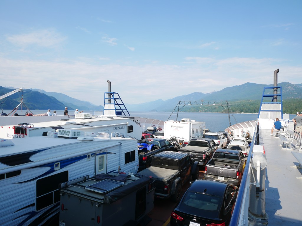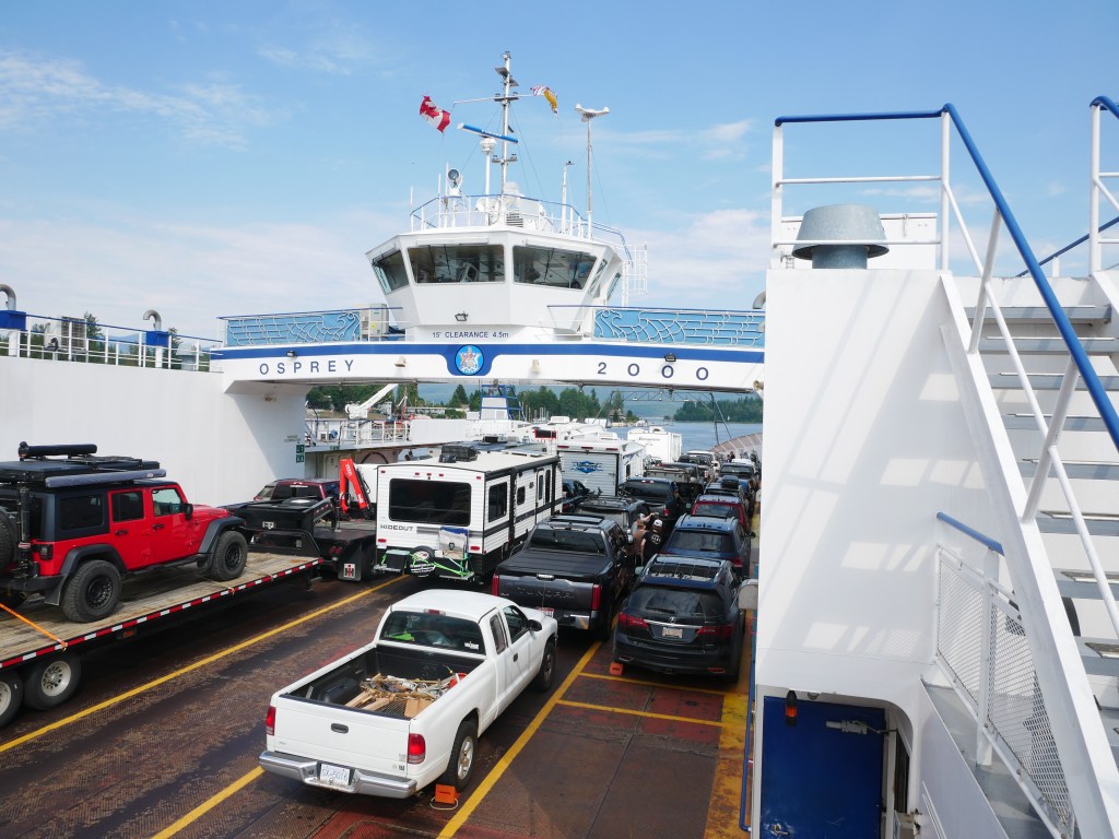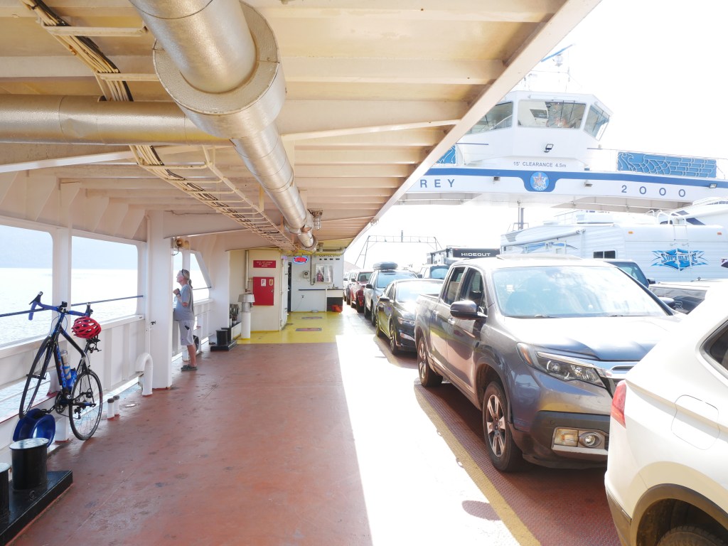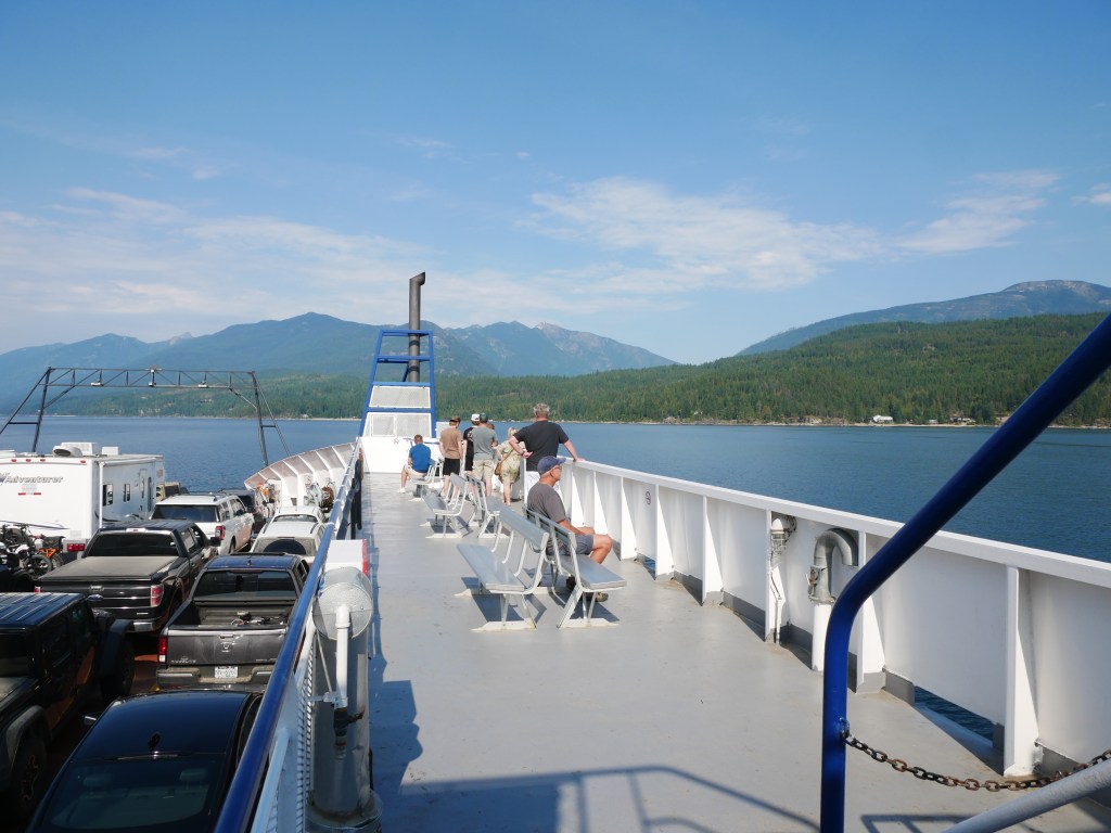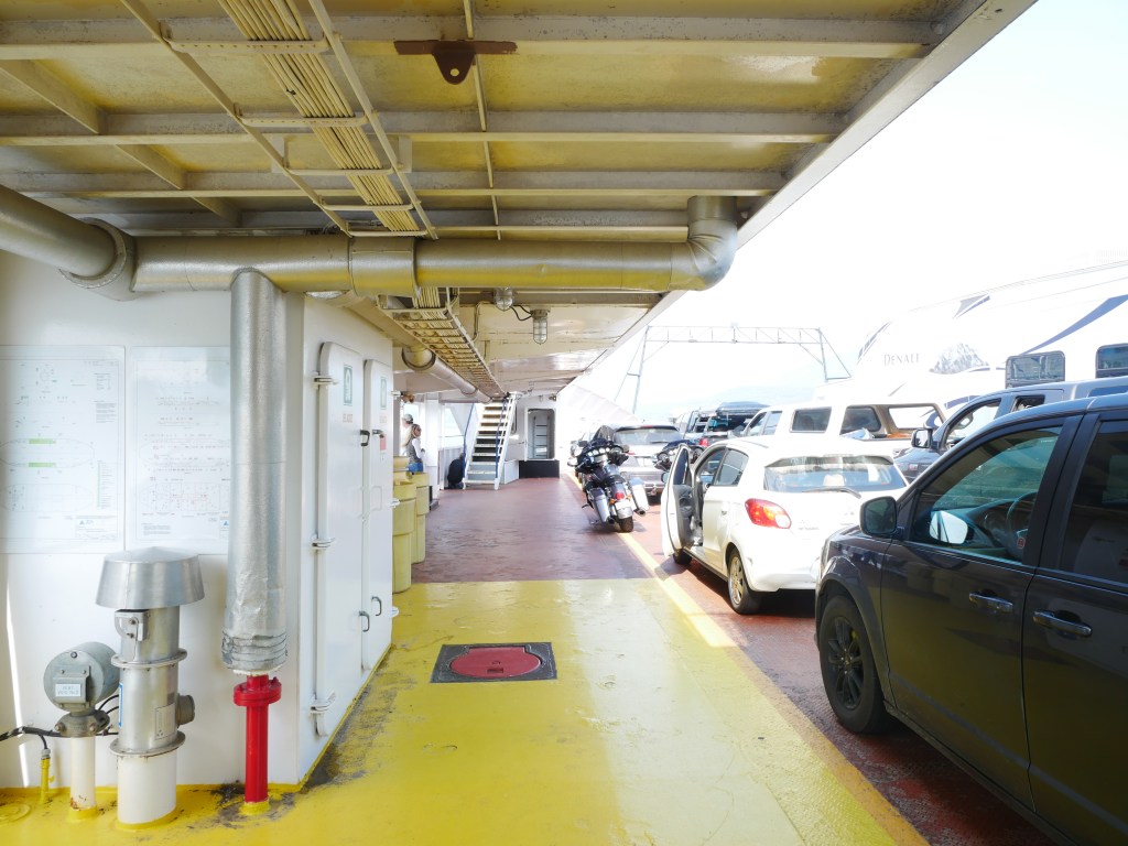 The Osprey 2000 is the newer and larger of the two vessels that operate on the route across Kootenay Lake.The Osprey 2000 en route to Balfour. The vessel is double-ended, with the No. 1 End facing Kootenay Bay and the No. 2 End facing Balfour.Though she is a double-ender, one could make the case that it is looks quite awkward aesthetically when the No. 2 End is the acting bow…The vessel has an open car deck that can accommodate 82 vehicles.View towards the No. 1 EndSmall passenger lounge on the port side on the car deck level.A small alcove beneath the rescue boat. On particularly busy sailings, additional vehicles can be parked in the space between the stairway and the yellow. There is a similar alcove on the starboard side.There is a snack bar on the car deck level on the starboard side.Another view of the snack barOne deck above the snack bar, there is another passenger lounge.Another view of the upper passenger cabinThere is a publicly accessible picklefork forward of the upper passenger cabin.There is a similar picklefork on the port side of the ferry, though that one is home to the rescue boat and public access is limited to the space forward thereof.Builder’s PlaqueOsprey 2000 and running mate Balfour docked at Balfour.Loading vehicles at Kootenay Bay on a chilly March evening.