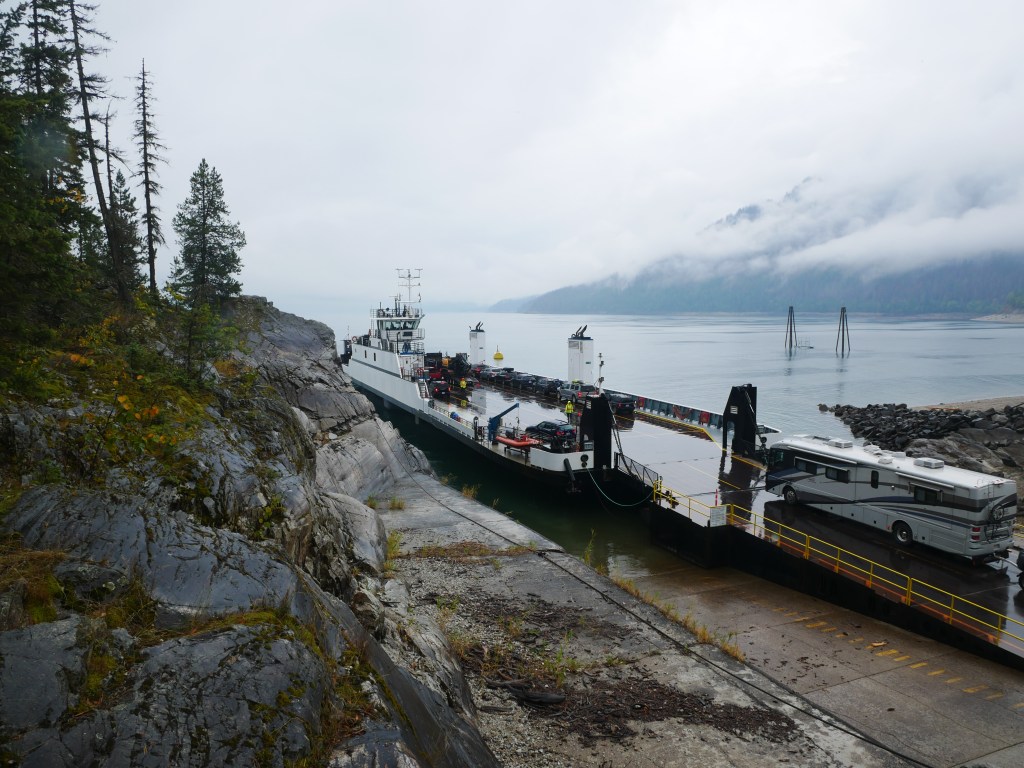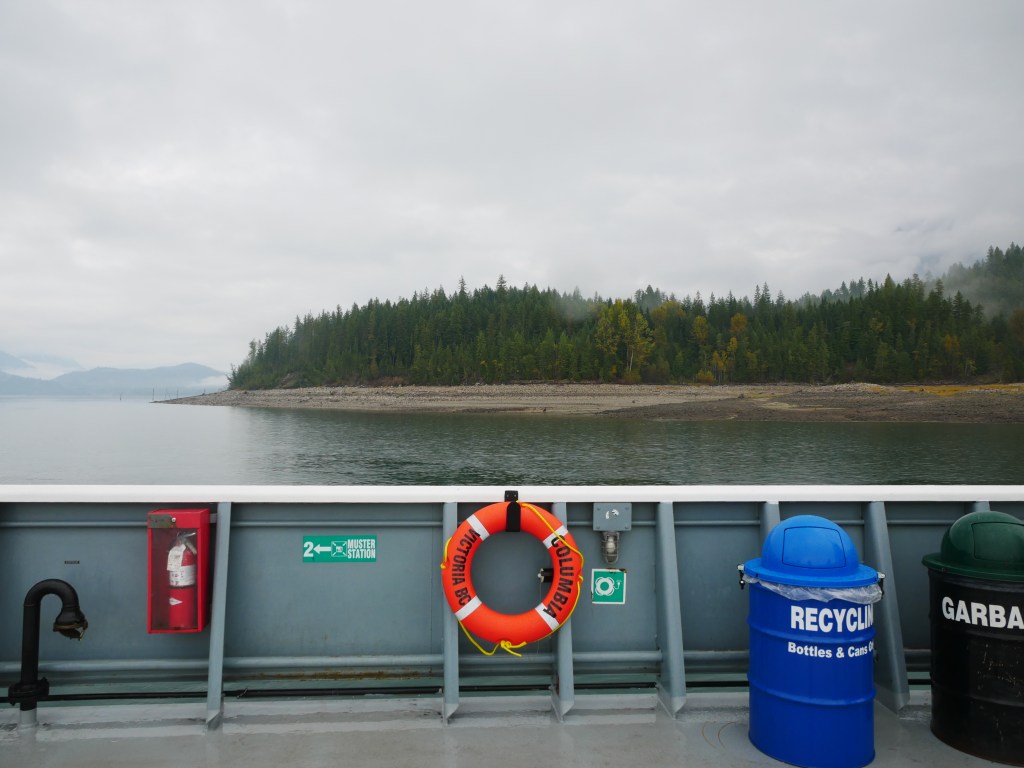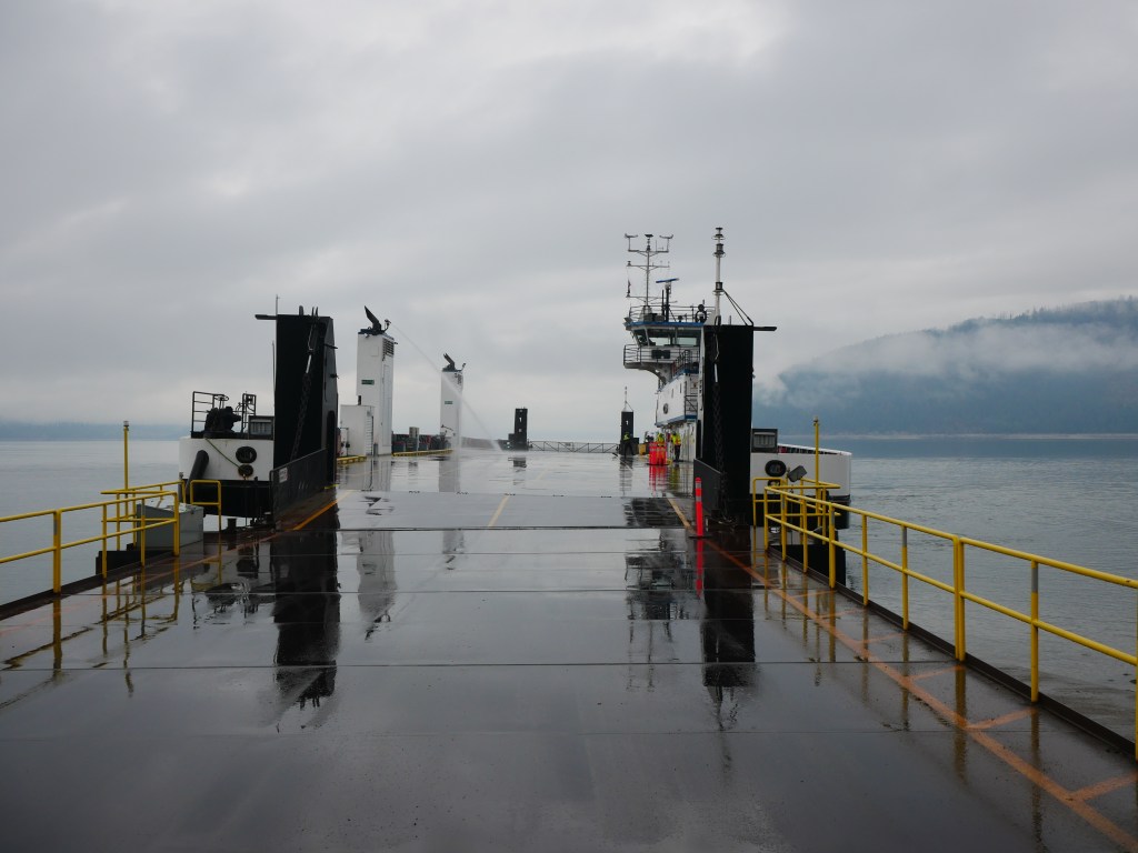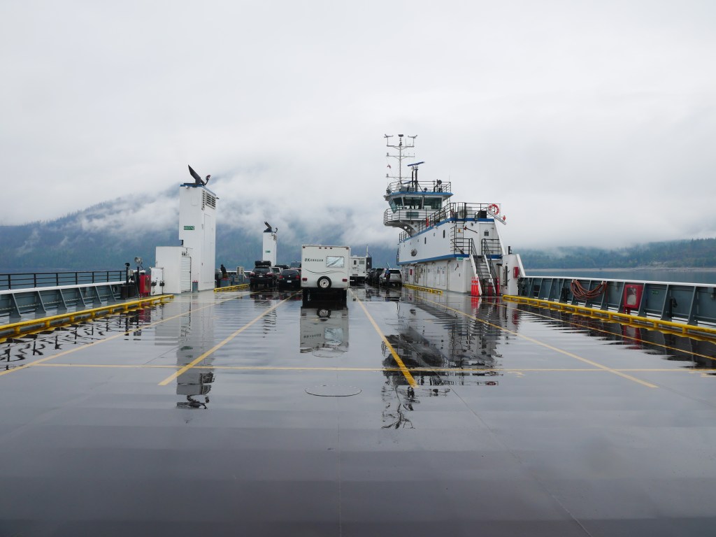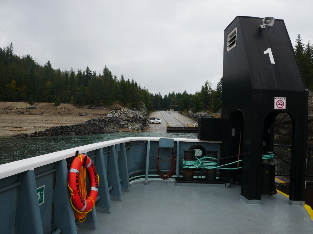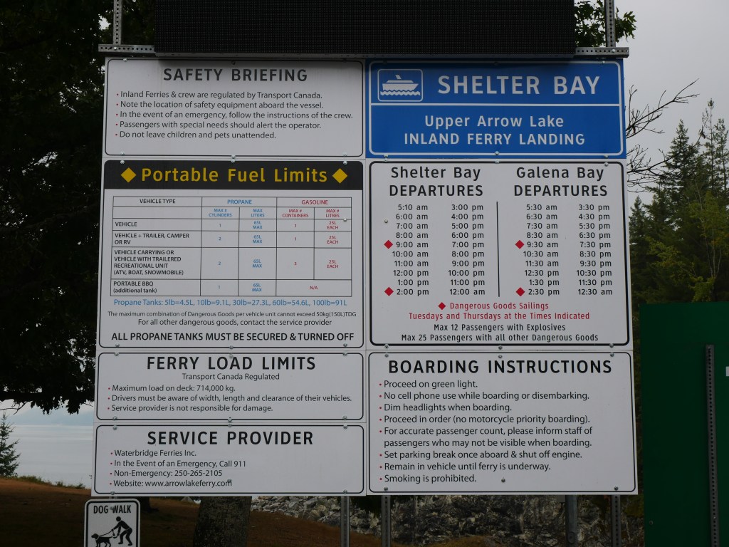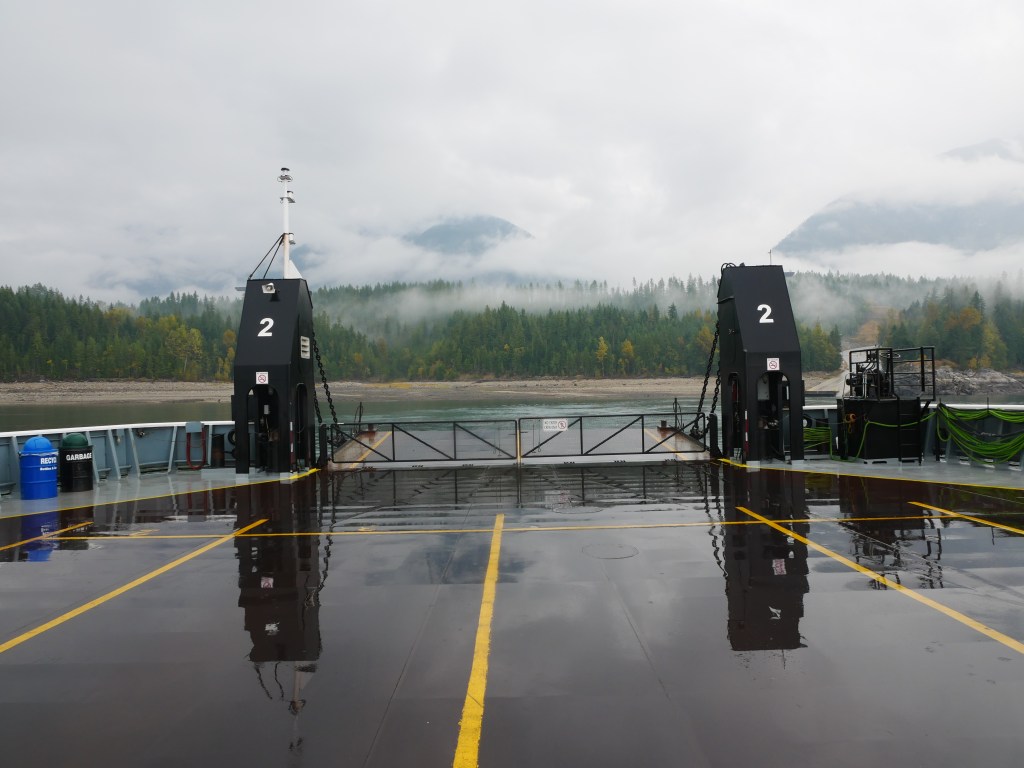 The Columbia carries B.C. 23 across the Columbia River about half way between Revelstoke and Nakusp.The Columbia can carry 80 vehicles and 250 passengers.Staging Area at the Shelter Bay terminal on the West (Revelstoke) side of the crossingLooking back up B.C. 23 towards RevelstokeInformational Signage at Shelter BayShelter Bay Landing from aboard the ColumbiaBluff next to the Shelter Bay landingColumbia is a very spartan but functional ferry.Builder’s PlaqueLooking Aft, an art piece by Kate Tupper displayed beneath the ferry’s wheelhouseCommunity Bulletin Boards. There is no passenger lounge on the Columbia, so the boards are simply affixed to the superstructure.The vessel has a chronic starboard list due to insufficient ballast counteracting the offset superstructure.Galena Bay (East / Nakusp Side) LandingThe No. 2 end faces Galena Bay, and the No. 1 end faces Shelter BayView North from near Galena BayShip and shore ramps at Galena Bay about to meetEmpty Car DeckColumbia docked at Galena BayThe ship’s starboard list is pronouncedAt 93.05 meters (305′ 3″), Columbia is the longest inland ferry in B.C., though the Osprey 2000 has a higher gross tonnage. Late September Upper Arrow Lakes sceneryView north from near Shelter BayOff-shore tie-up location near Shelter Bay. Back when there were two ferries on this route, one of them would tie-up for the night against these dolphins, with its crew being ferried to/from shore by the other vessel.Arriving Shelter BayLoading Traffic for another sailing to Galena Bay