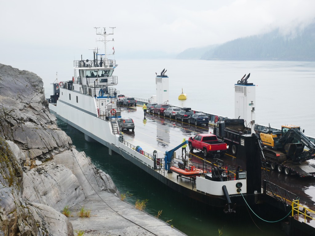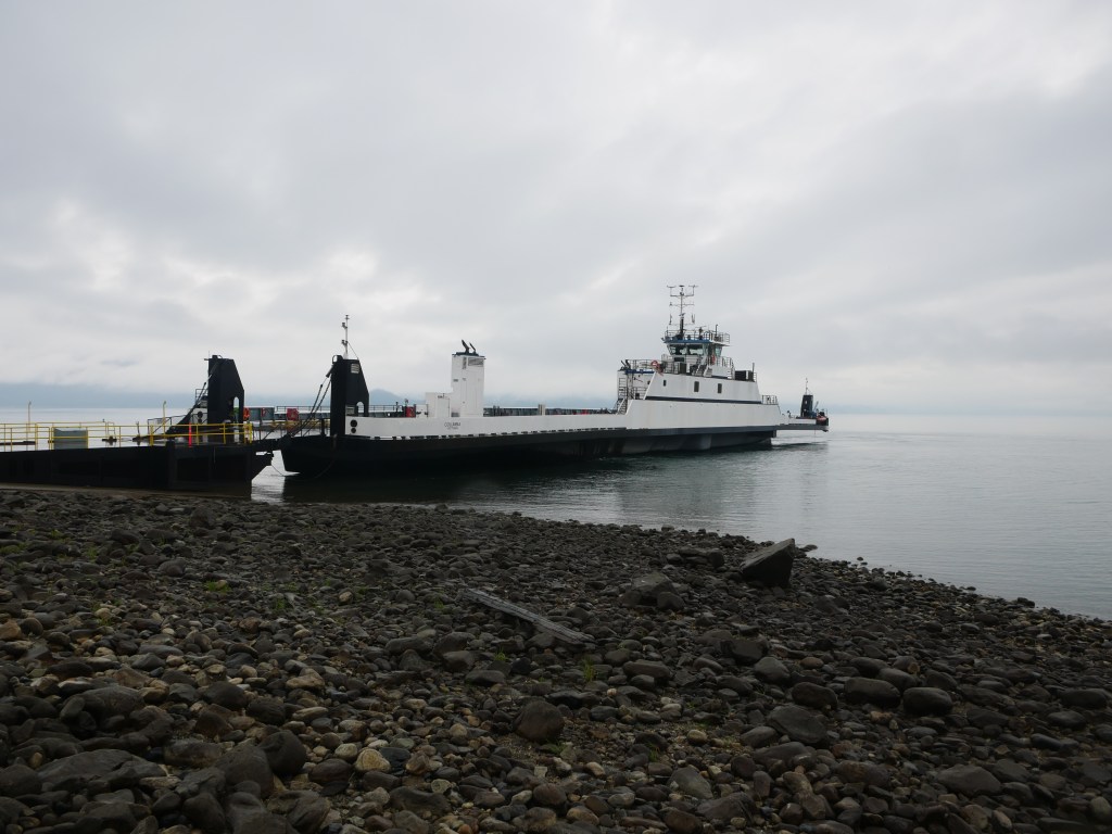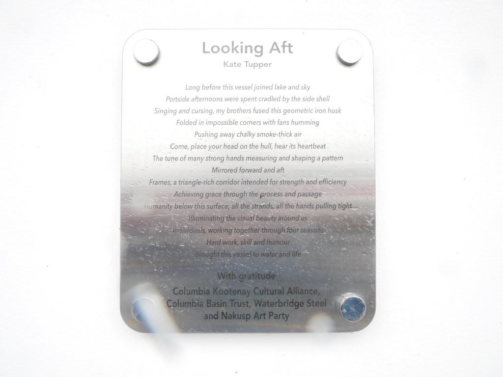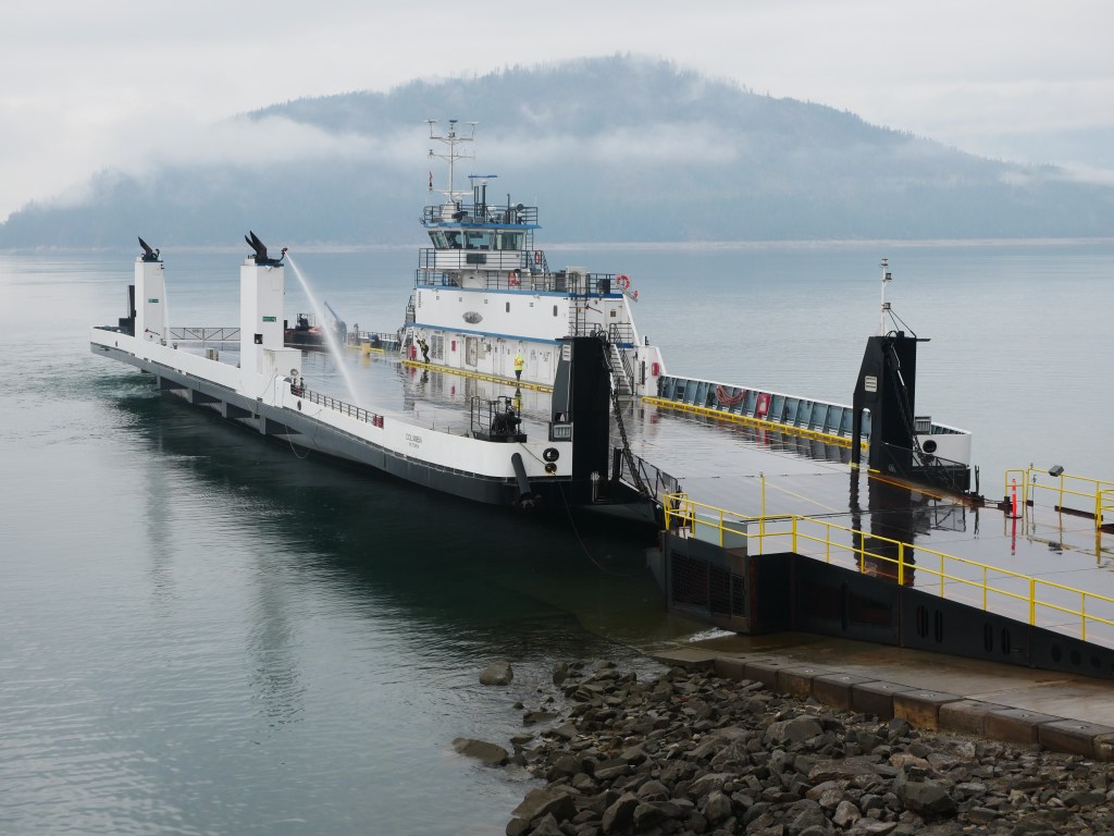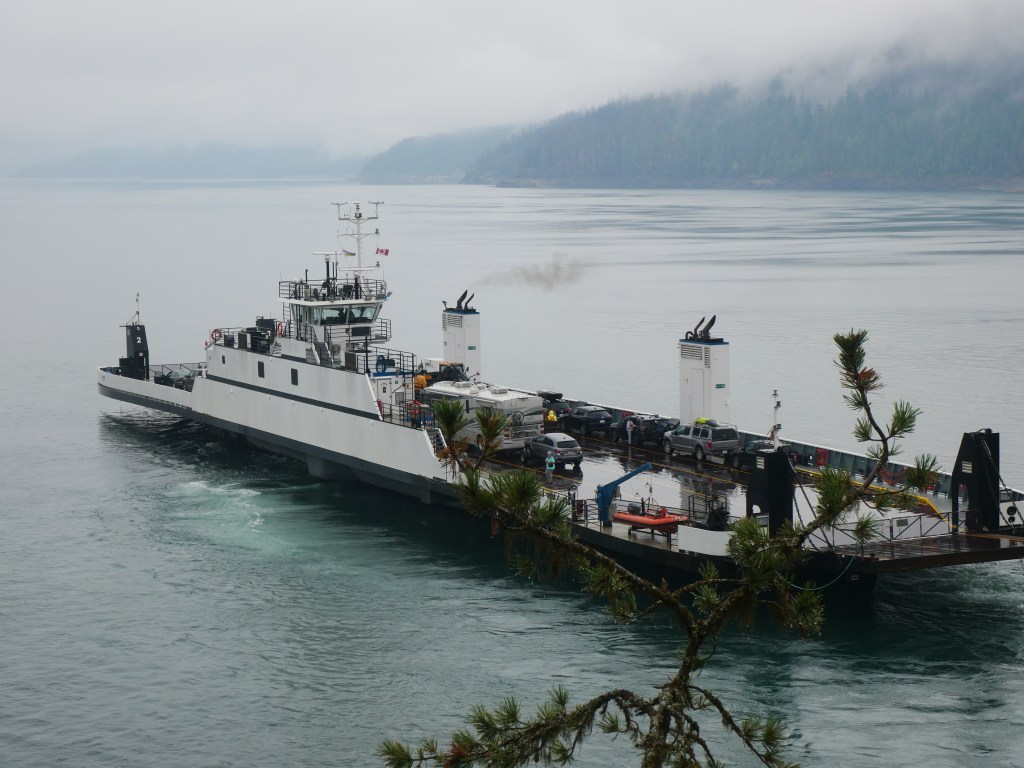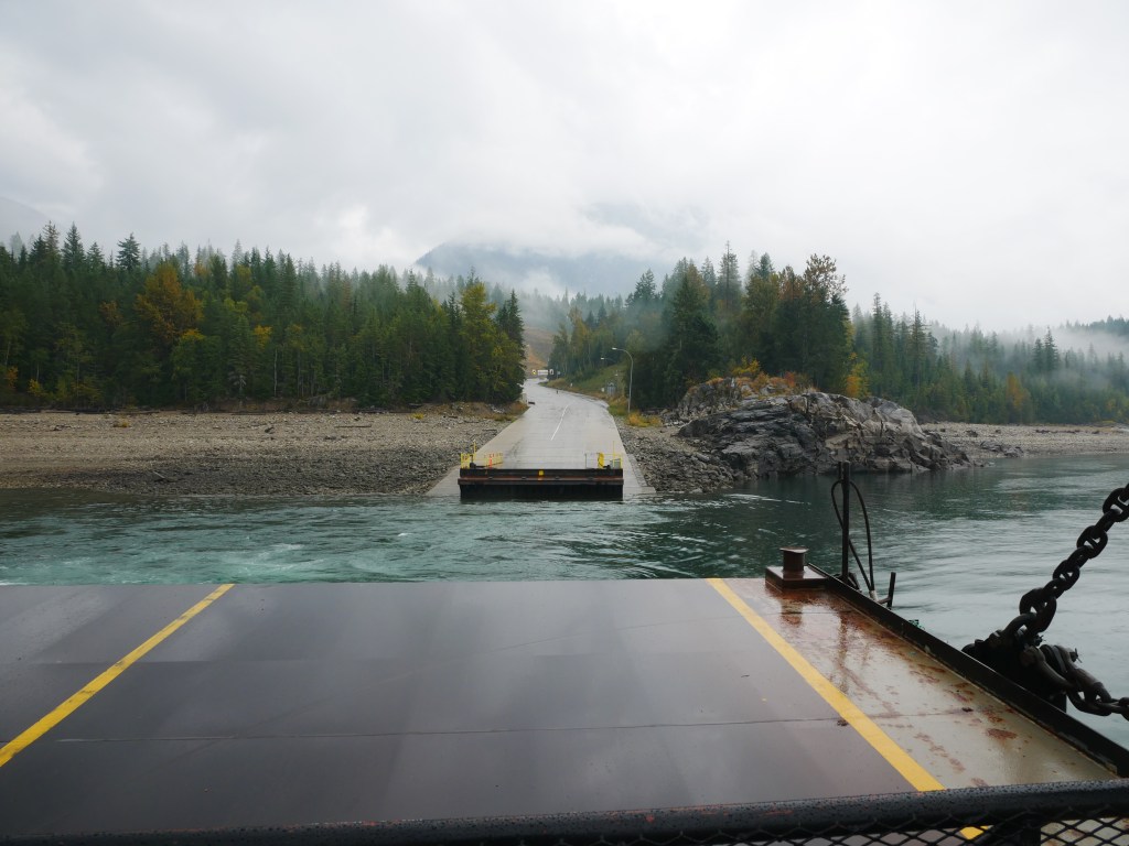 The Columbia carries B.C. 23 across the Columbia River about half way between Revelstoke and Nakusp.The Columbia can carry 80 vehicles and 250 passengers.Staging Area at the Shelter Bay terminal on the West (Revelstoke) side of the crossingLooking back up B.C. 23 towards RevelstokeInformational Signage at Shelter BayShelter Bay Landing from aboard the ColumbiaBluff next to the Shelter Bay landingColumbia is a very spartan but functional ferry.Builder’s PlaqueLooking Aft, an art piece by Kate Tupper displayed beneath the ferry’s wheelhouseCommunity Bulletin Boards. There is no passenger lounge on the Columbia, so the boards are simply affixed to the superstructure.The vessel has a chronic starboard list due to insufficient ballast counteracting the offset superstructure.Galena Bay (East / Nakusp Side) LandingThe No. 2 end faces Galena Bay, and the No. 1 end faces Shelter BayView North from near Galena BayShip and shore ramps at Galena Bay about to meetEmpty Car DeckColumbia docked at Galena BayThe ship’s starboard list is pronouncedAt 93.05 meters (305′ 3″), Columbia is the longest inland ferry in B.C., though the Osprey 2000 has a higher gross tonnage. Late September Upper Arrow Lakes sceneryView north from near Shelter BayOff-shore tie-up location near Shelter Bay. Back when there were two ferries on this route, one of them would tie-up for the night against these dolphins, with its crew being ferried to/from shore by the other vessel.Arriving Shelter BayLoading Traffic for another sailing to Galena Bay